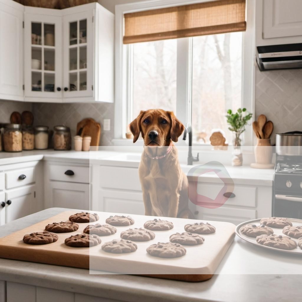 A cozy kitchen with freshly baked cookies on the counter and a dog waiting eagerly for a treat