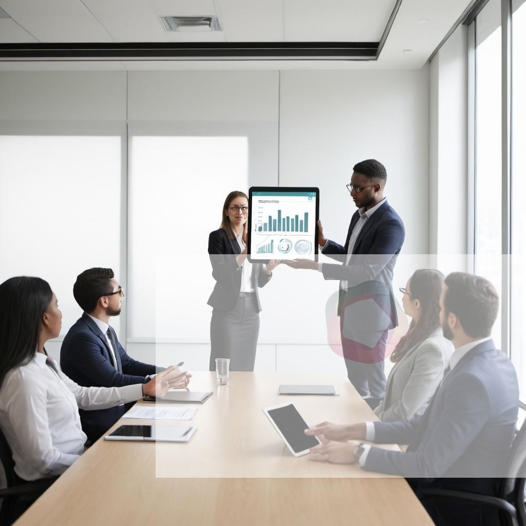 An employee giving a presentation using a tablet in a meeting room