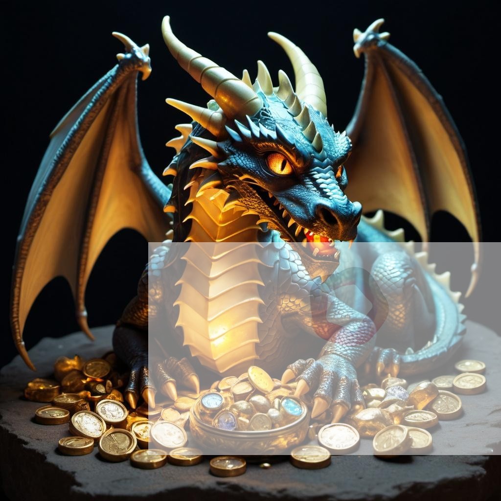 A dragon curled up around a treasure hoard, its eyes glowing in the dim light