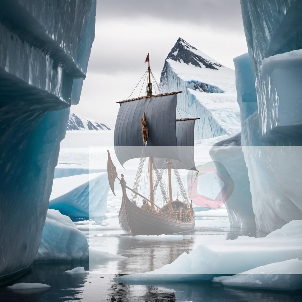 A Viking ship sailing through icy waters surrounded by towering icebergs