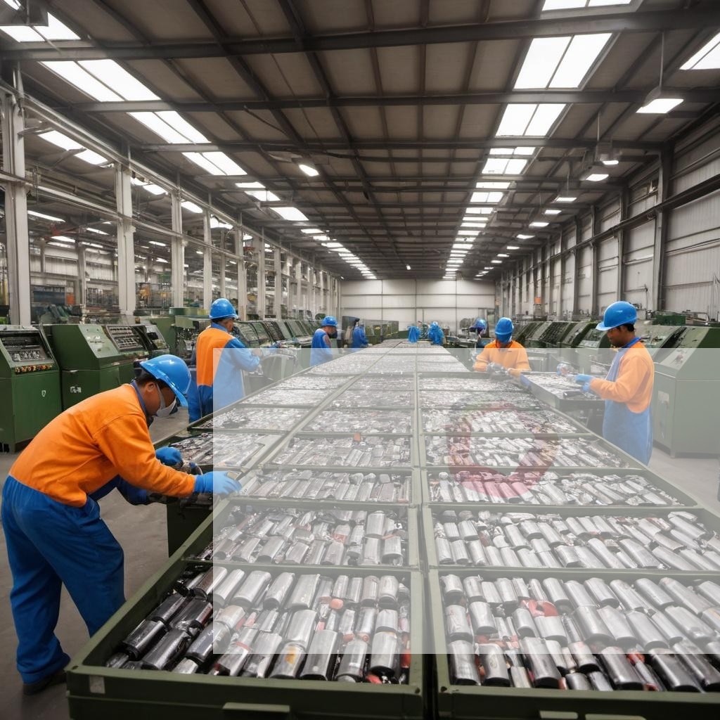 A battery recycling plant with workers processing used batteries