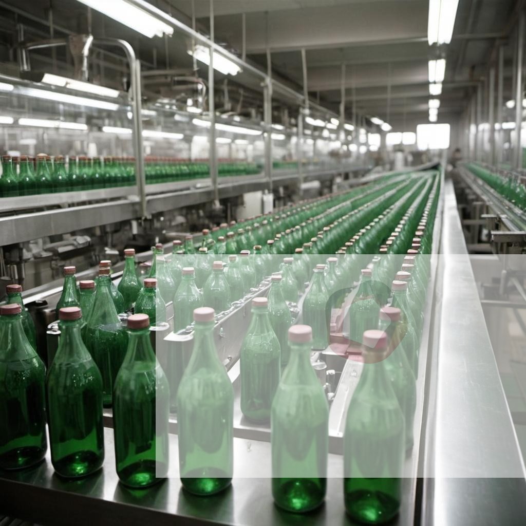A beverage factory with bottles moving along an assembly line
