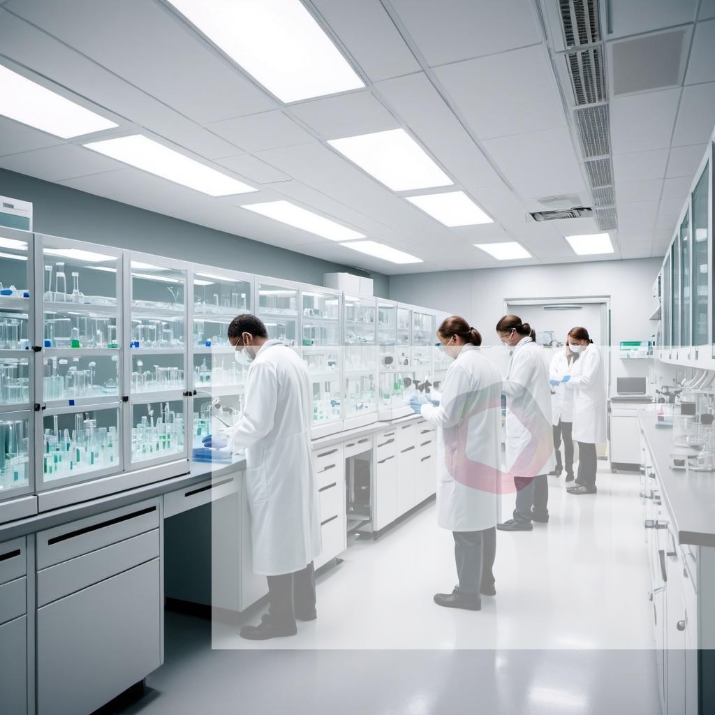 A biotechnology plant with scientists producing vaccines and medicines