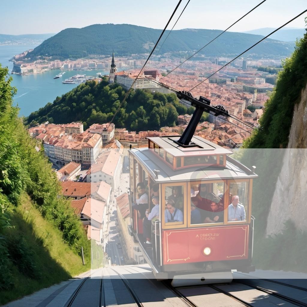 A cable car climbing a steep hill in a European city