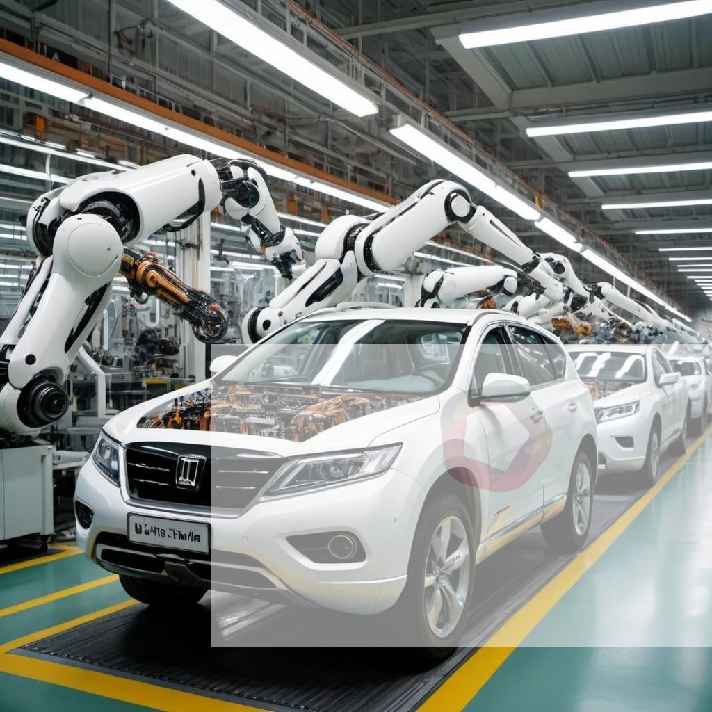 A car manufacturing plant with robotic arms assembling vehicles