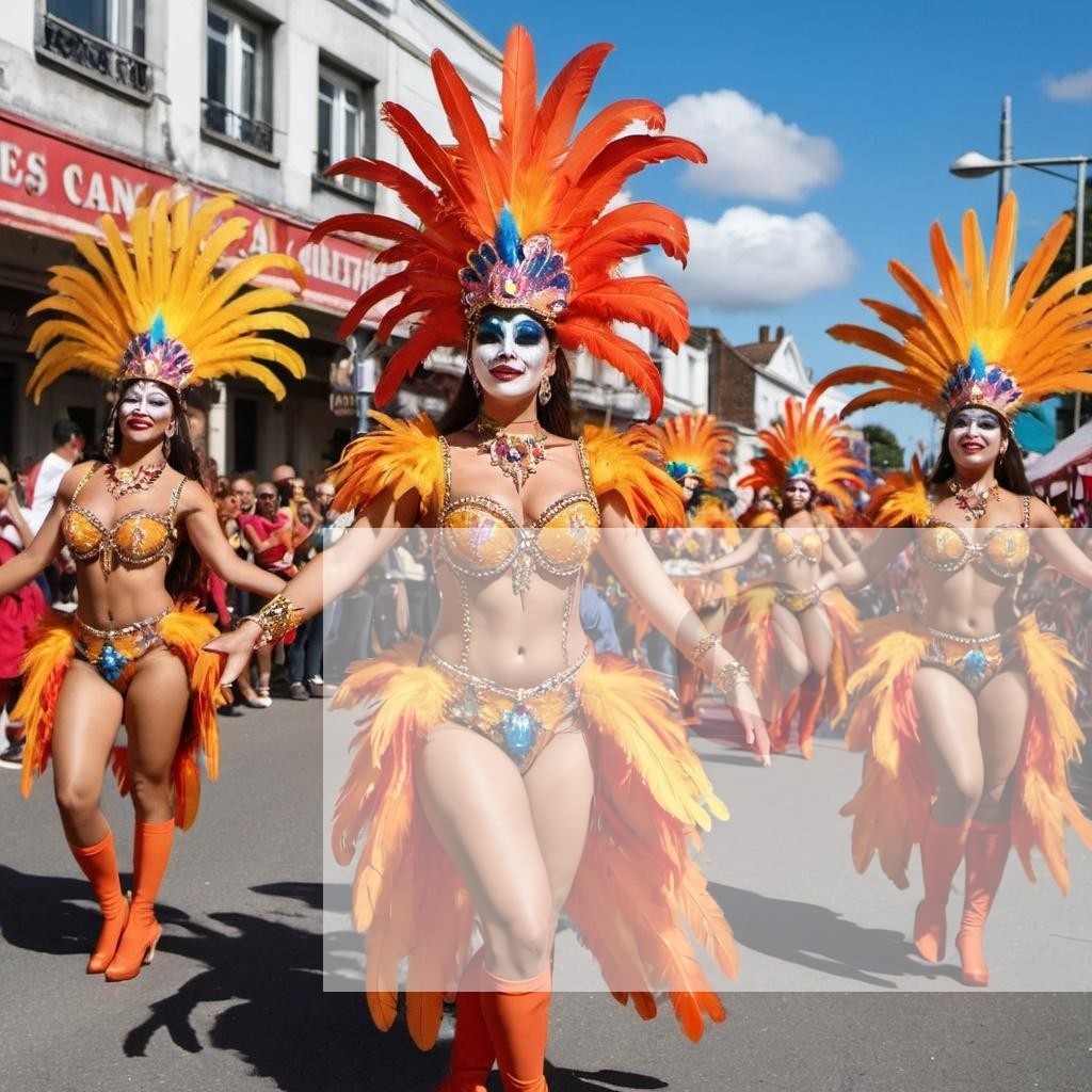 A carnival parade with dancers in elaborate costumes and bright feathers