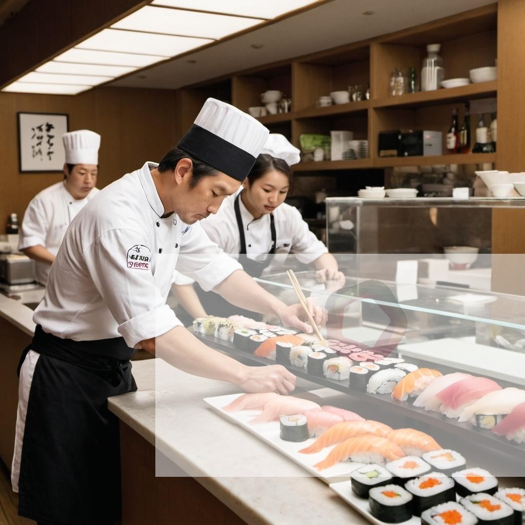 A chef preparing sushi at a high-end sushi bar with people seated around