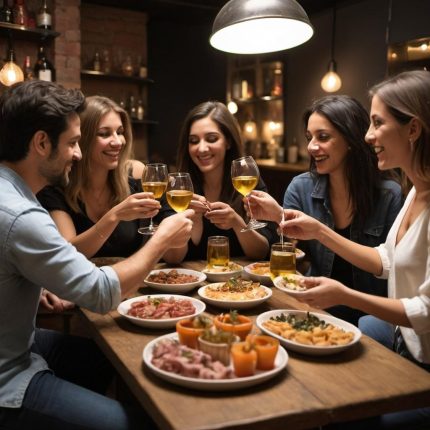 A group of friends enjoying tapas at a bustling Spanish tapas bar