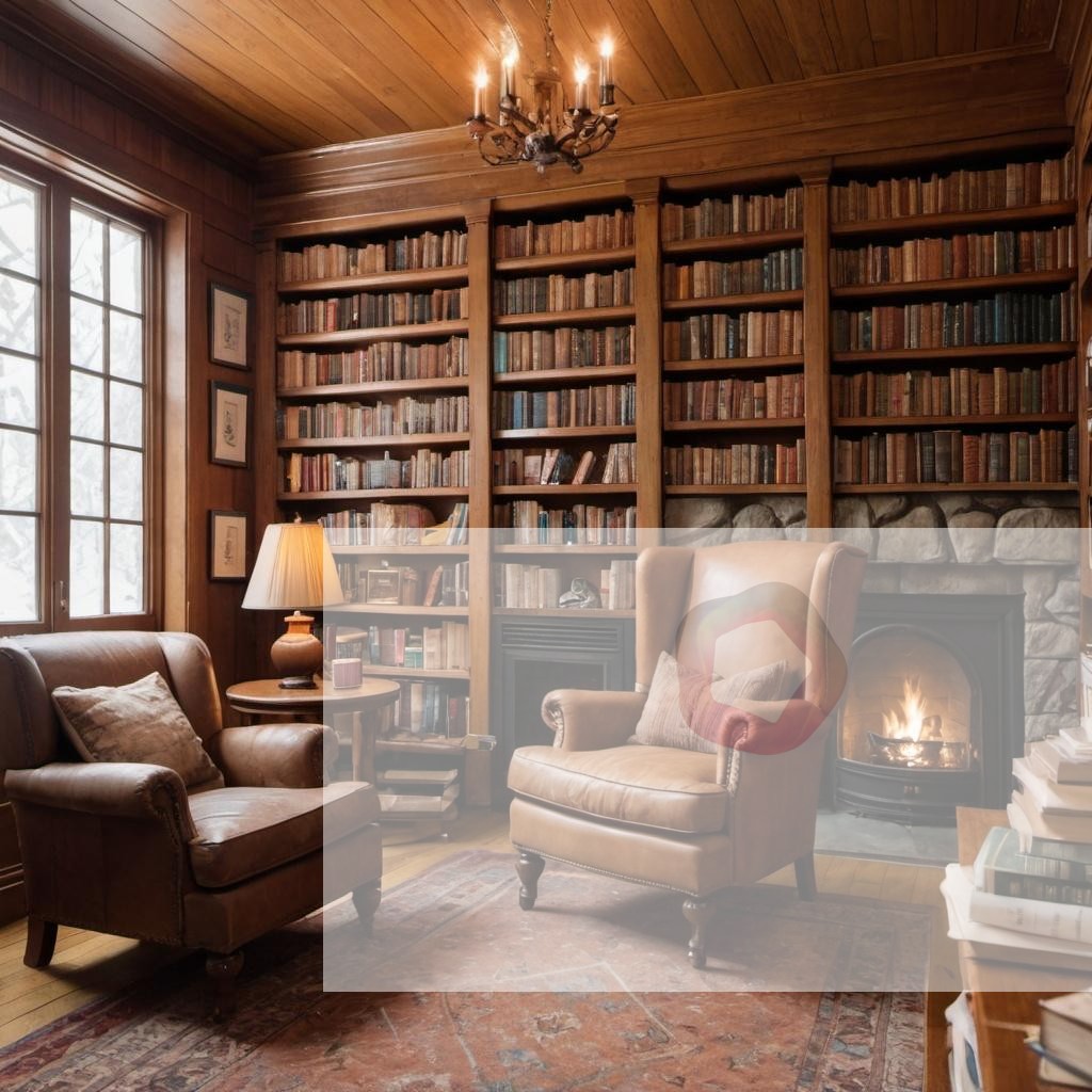 A cozy library with tall wooden shelves, books stacked high, and a comfy armchair next to a crackling fireplace