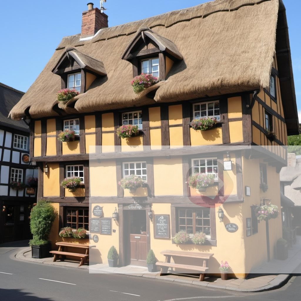 A cozy, traditional European pub with a thatched roof and wooden beams