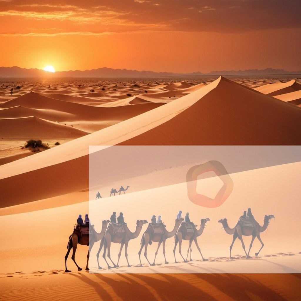 A desert landscape with giant sand dunes, a caravan of camels, and a brilliant orange sunset