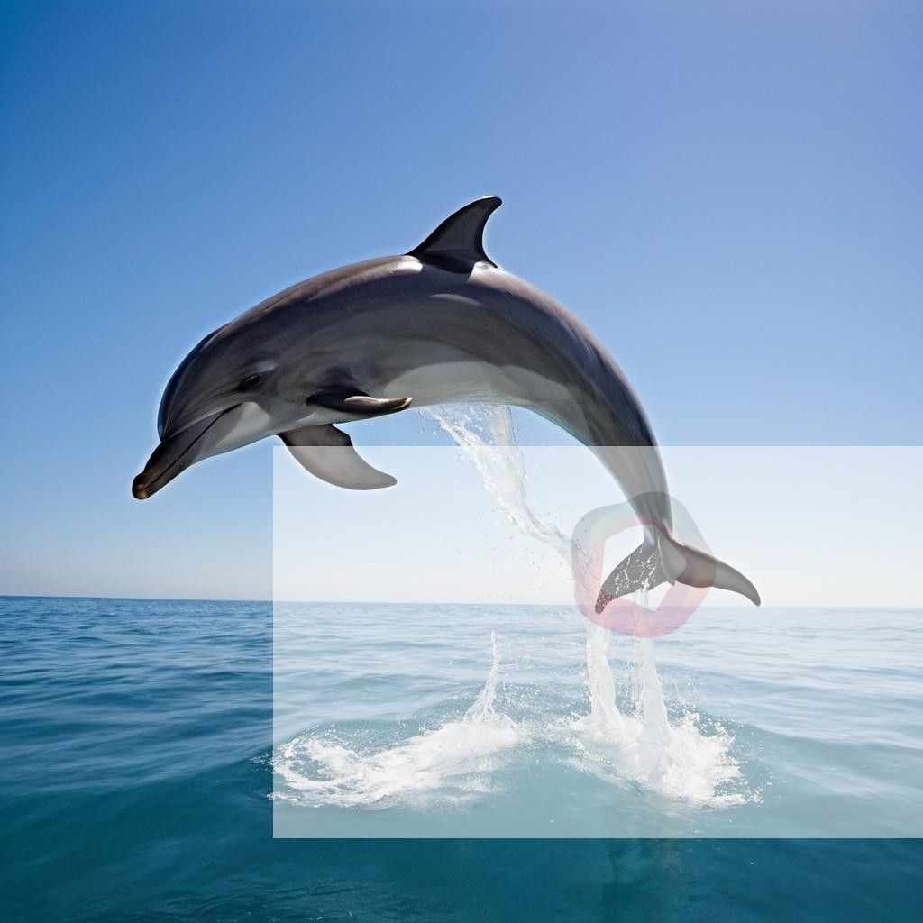 A dolphin leaping out of the ocean under a clear blue sky
