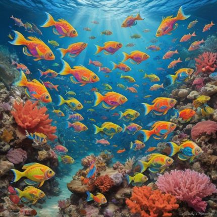 A school of colorful fish swimming around a coral reef