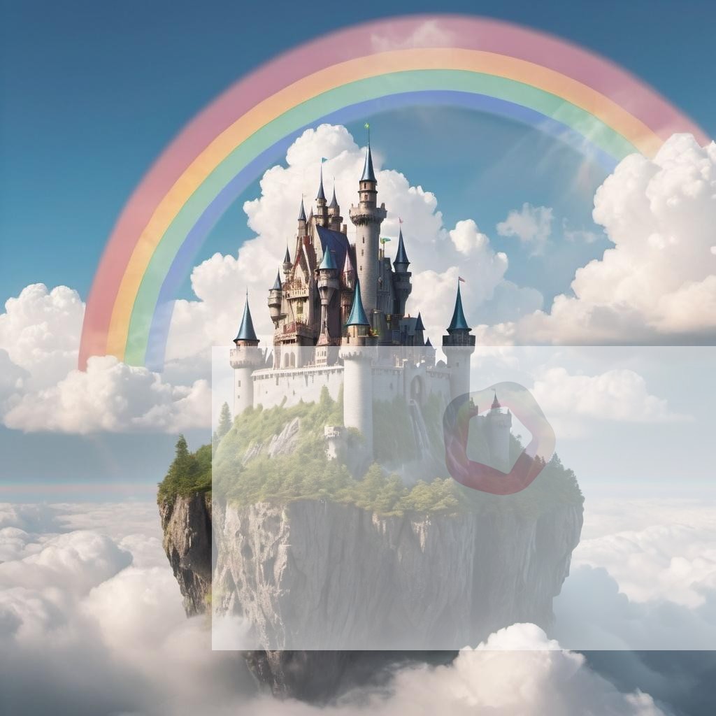 A fantasy castle floating among the clouds with a rainbow