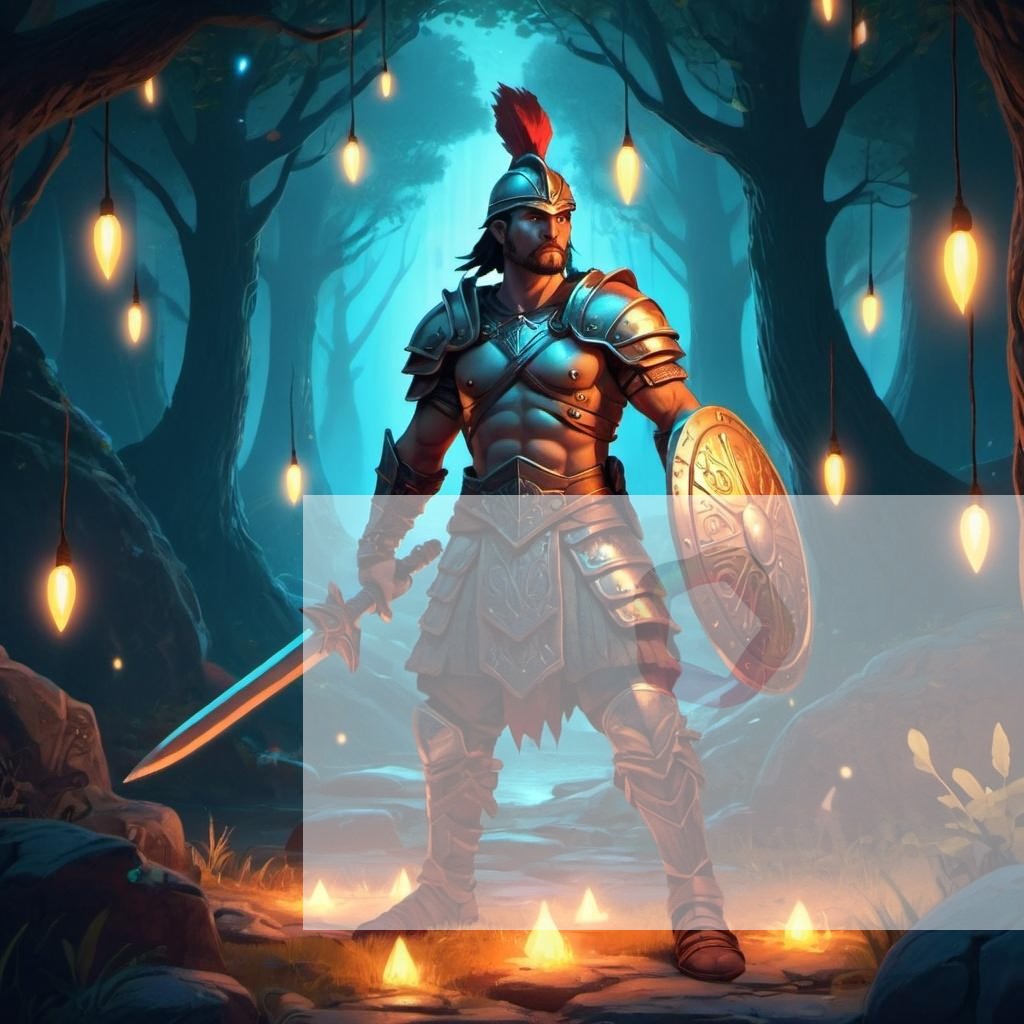 This image depicts a fantasy scene with a warrior, in a abstract style, featuring dynamic lighting. It captures the essence of the theme with vivid details and a captivating atmosphere, making it perfect for various creative projects.