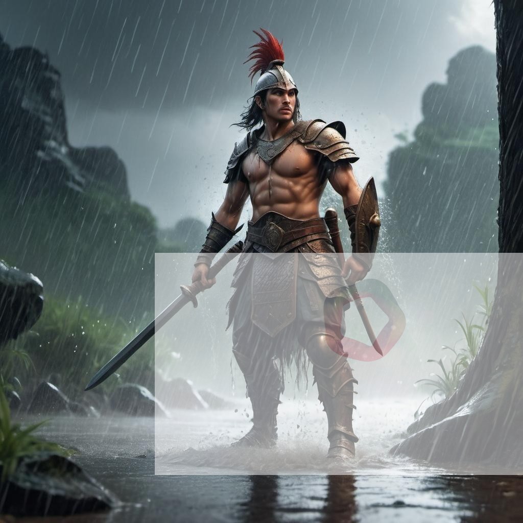 Home Fantasy & Science Fiction A fantasy scene with a warrior, in a abstract style, featuring rainfall.