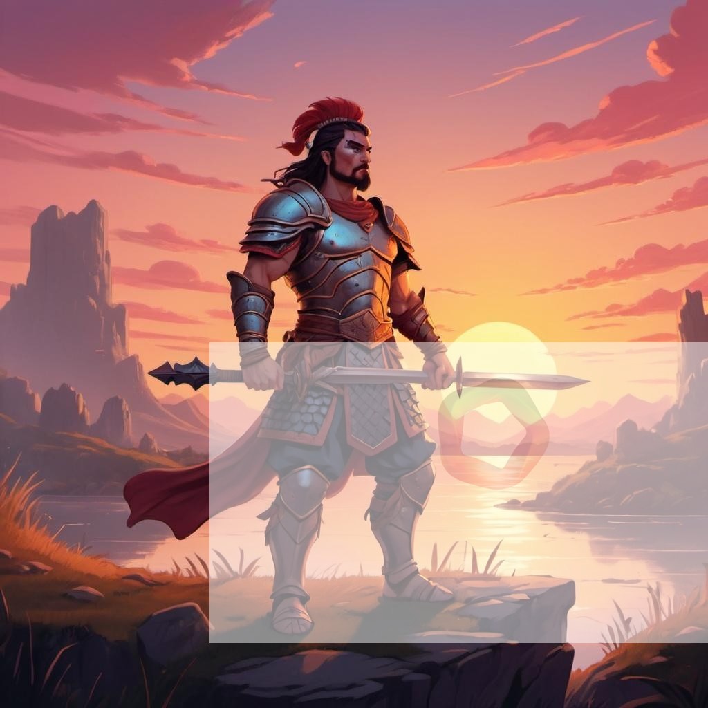This image depicts a fantasy scene with a warrior, in a abstract style, featuring sunset background. It captures the essence of the theme with vivid details and a captivating atmosphere, making it perfect for various creative projects.