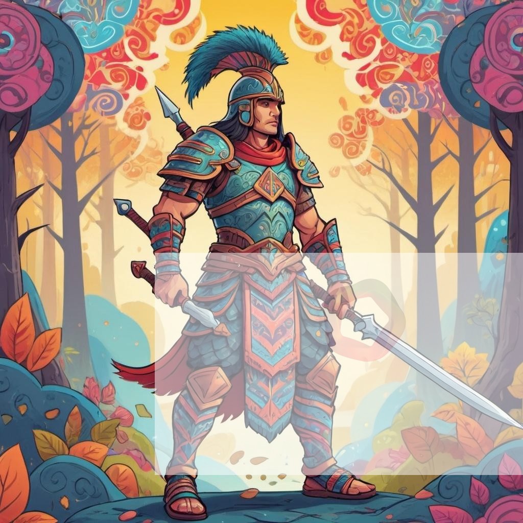 This image depicts a fantasy scene with a warrior, in a cartoonish style, featuring colorful patterns. It captures the essence of the theme with vivid details and a captivating atmosphere, making it perfect for various creative projects.