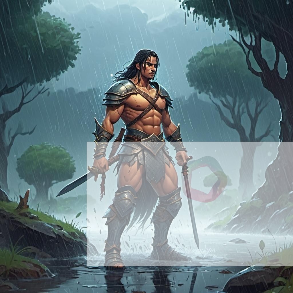 This image depicts a fantasy scene with a warrior, in a surreal style, featuring rainfall. It captures the essence of the theme with vivid details and a captivating atmosphere, making it perfect for various creative projects.