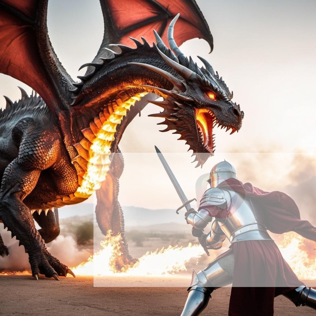 A fierce dragon breathing fire in a battle with a knight in shining armor