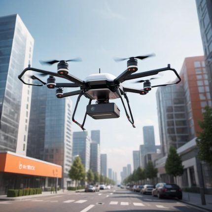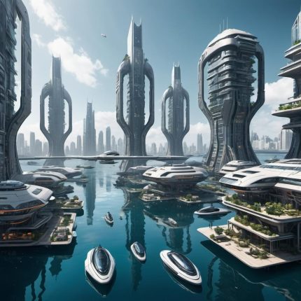 A bustling futuristic cityscape with flying cars and towering holographic advertisements, sci-fi theme