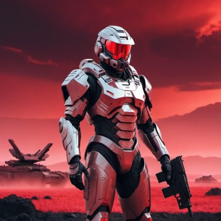 A futuristic soldier in high-tech armor standing on a battlefield under a red sky