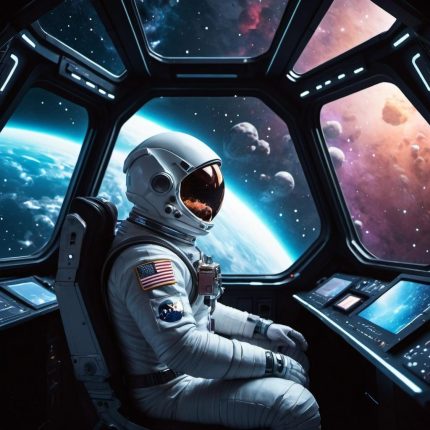 A futuristic spaceship cockpit with an astronaut gazing out at a distant galaxy, glowing with stars