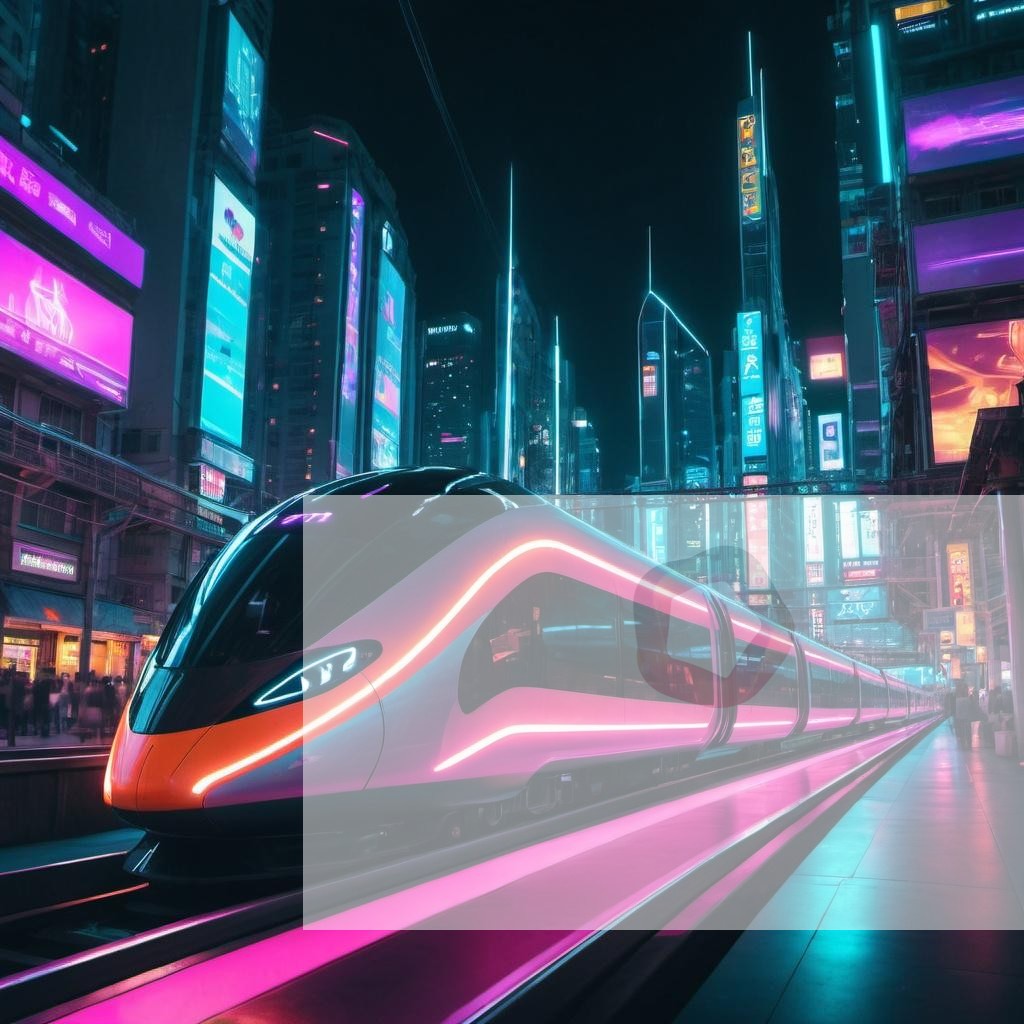 Home Futuristic A futuristic train speeding through a neon-lit cityscape at night