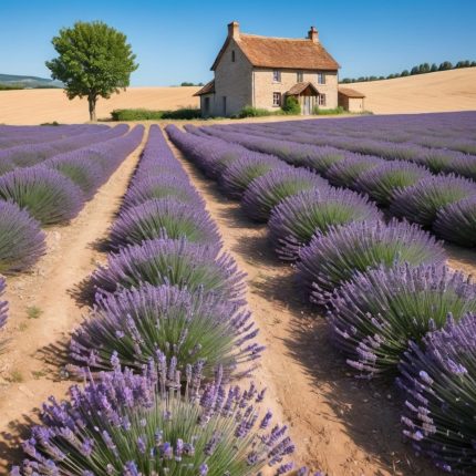 A serene field of lavender under a clear blue sky with a small farmhouse in the distance $68.00 Original price was: $68.00.$54.40Current price is: $54.40.