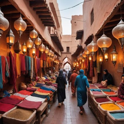A bustling Moroccan market with colorful fabrics spices and intricate lanterns