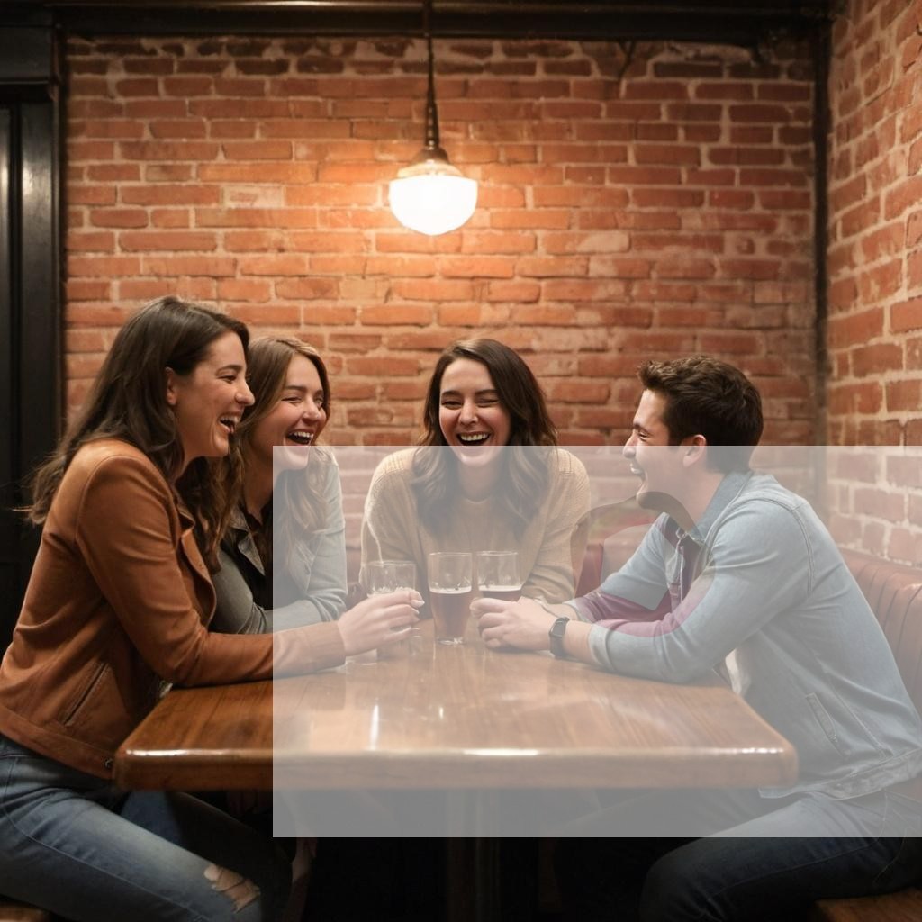 A group of friends laughing and chatting at a cozy bar with exposed brick walls