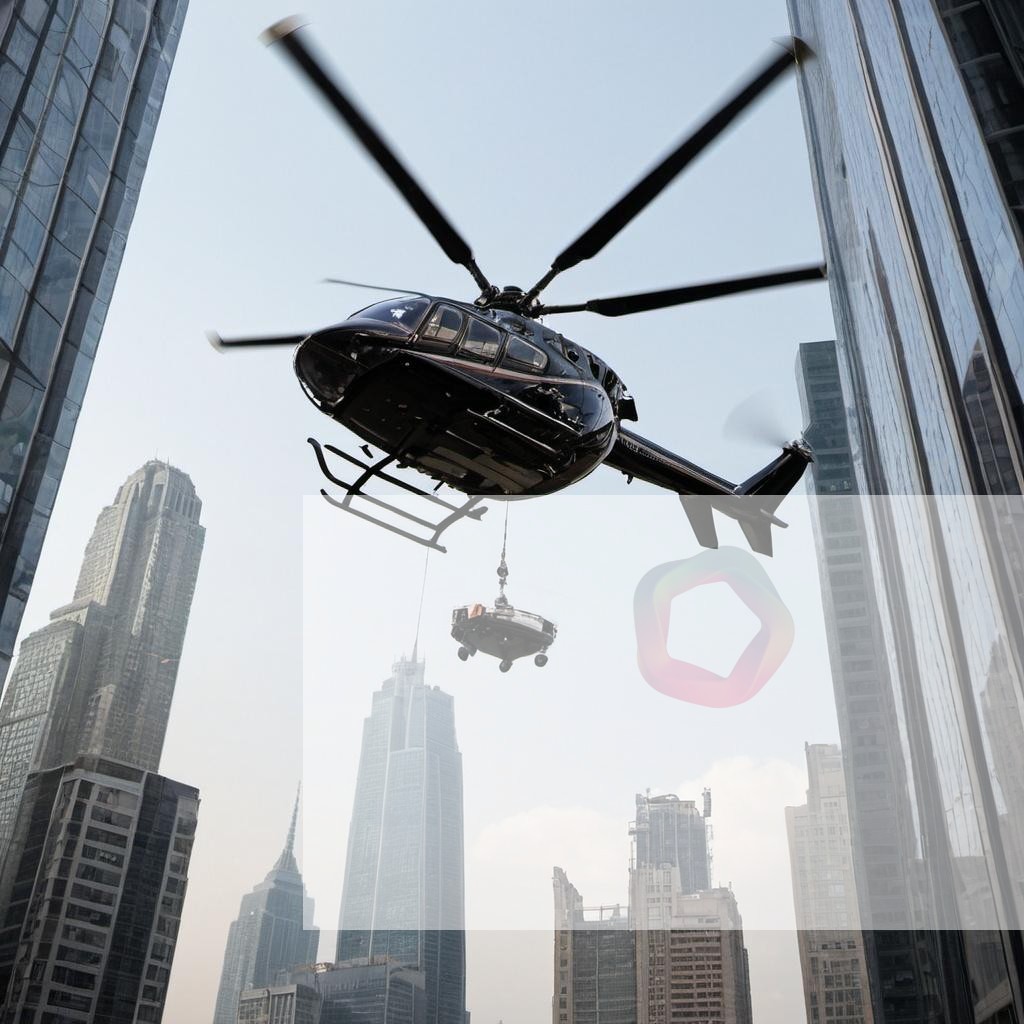A helicopter hovering over a skyscraper in a bustling metropolis