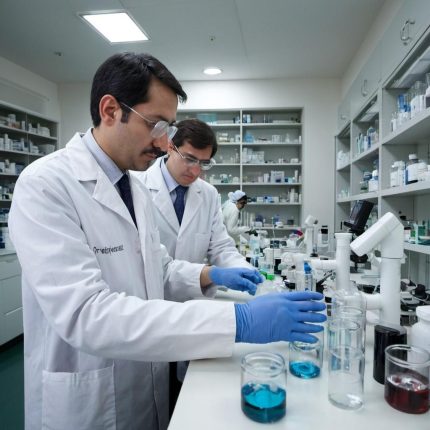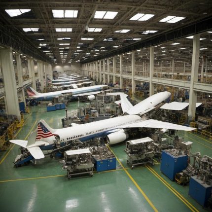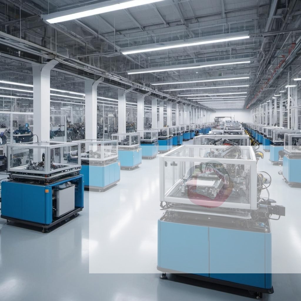 A high-tech robotics factory with automated machines assembling products