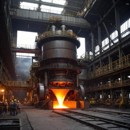 A large steel mill with molten metal being poured into molds