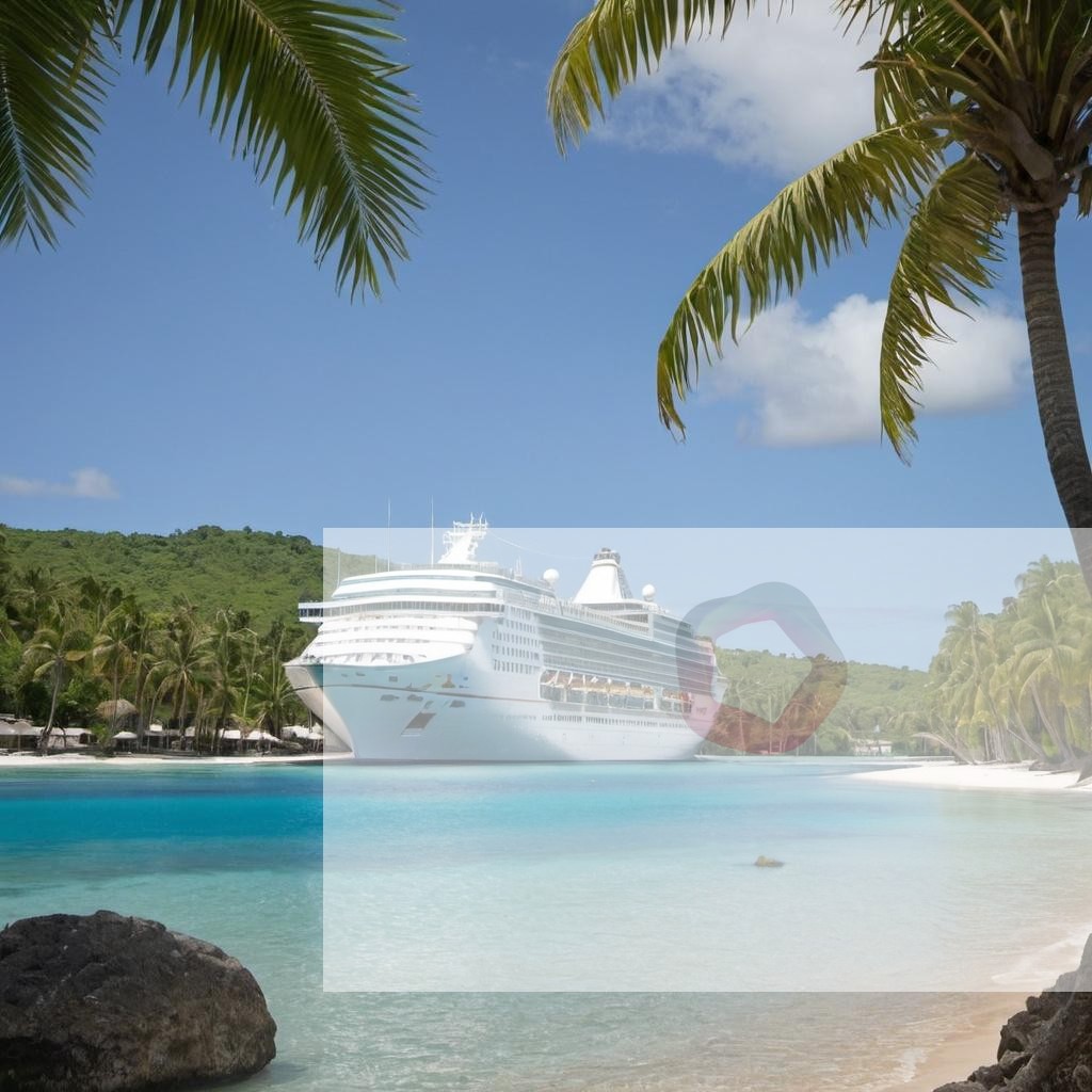 A large cruise ship docked at a tropical island with palm trees and clear water