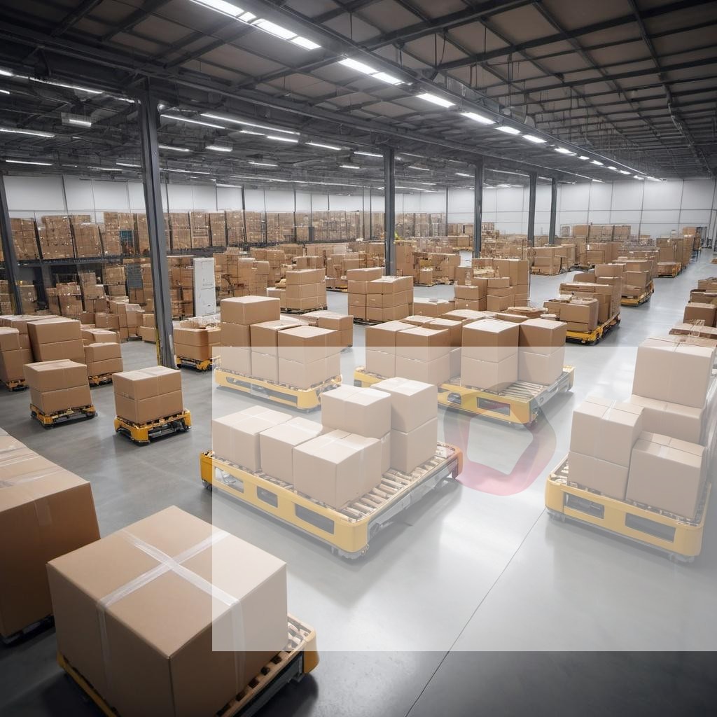Home Industries A modern warehouse with robots sorting packages for delivery