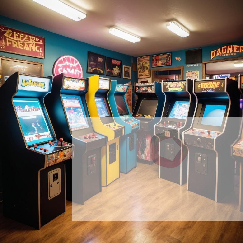 A retro arcade filled with vintage game machines, teenagers playing enthusiastically