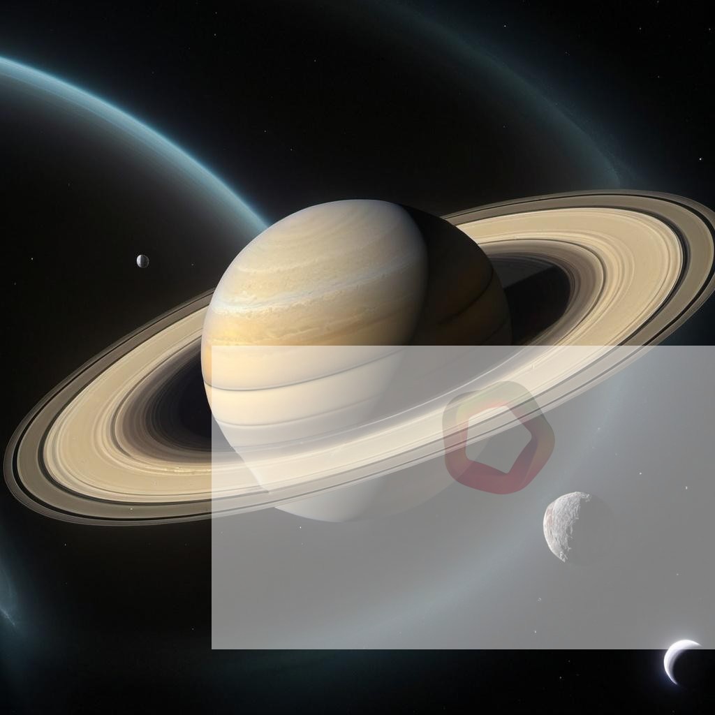 A ringed planet like Saturn with icy rings and moons orbiting it