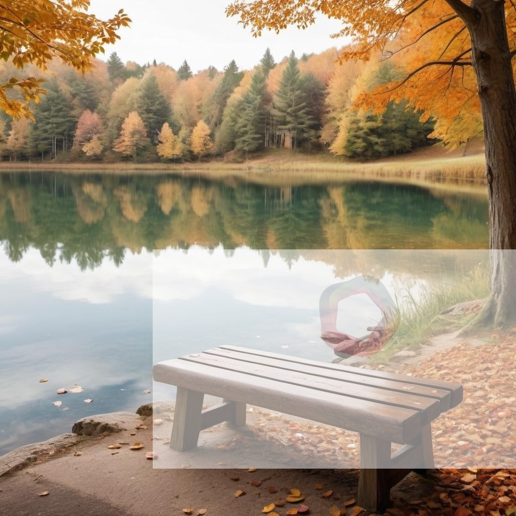 A serene autumn landscape with falling leaves a wooden bench and a clear lake reflecting the scenery
