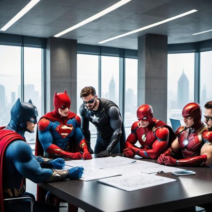 A group of superheroes planning their next mission in a high-tech headquarters