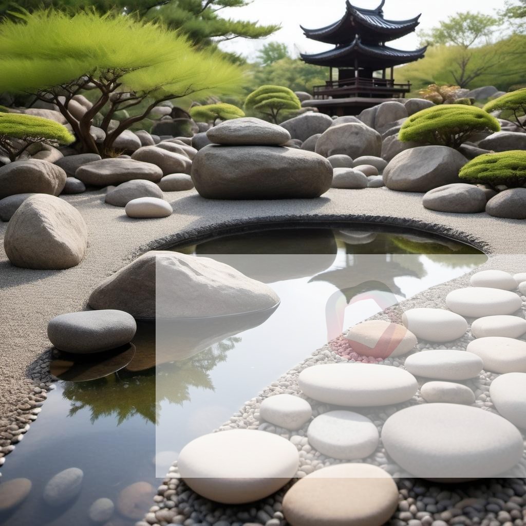 A serene Zen rock garden with carefully placed stones and a tranquil pond reflecting the sky