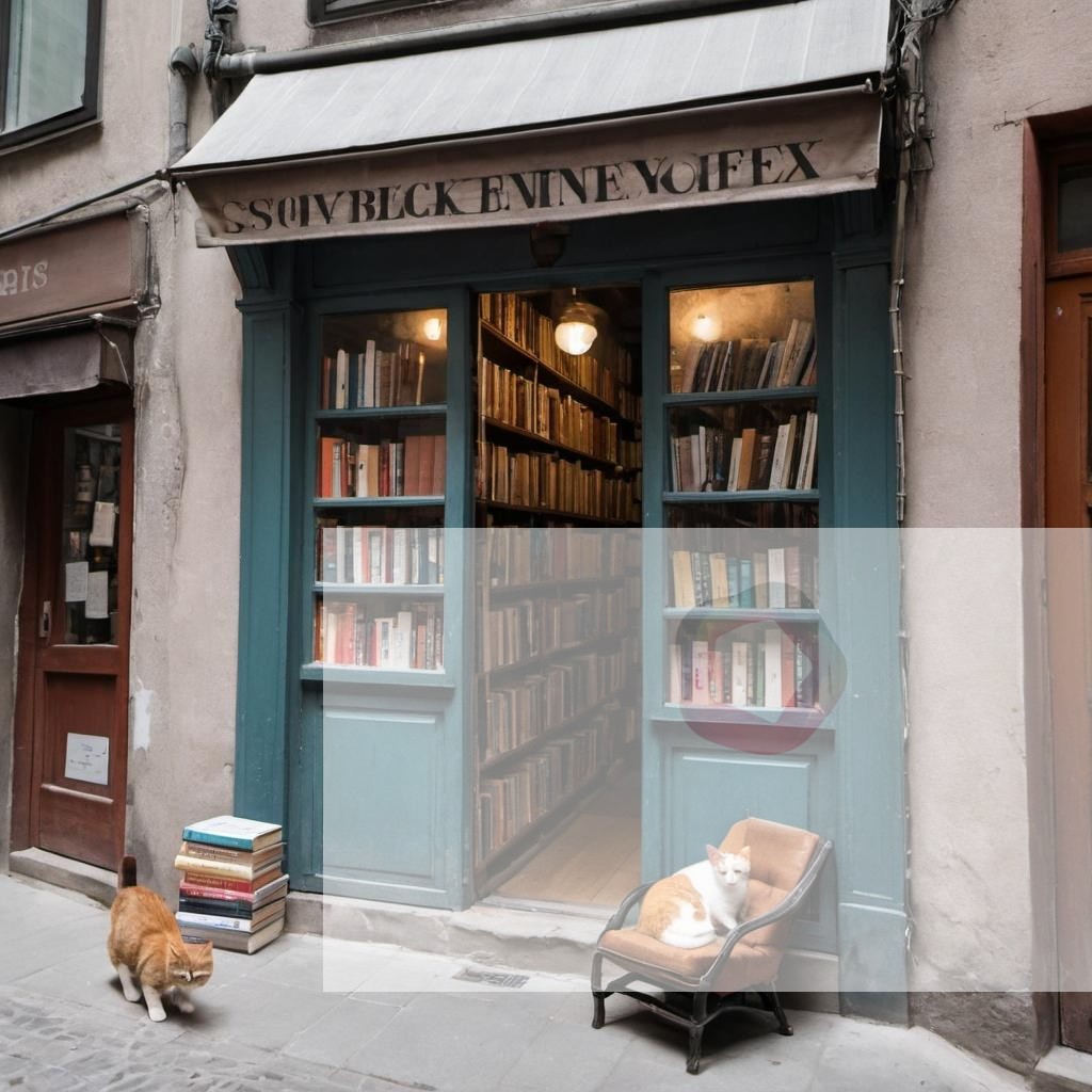 A small, cozy bookstore in a narrow alleyway, with books stacked high and a cat sleeping in the window