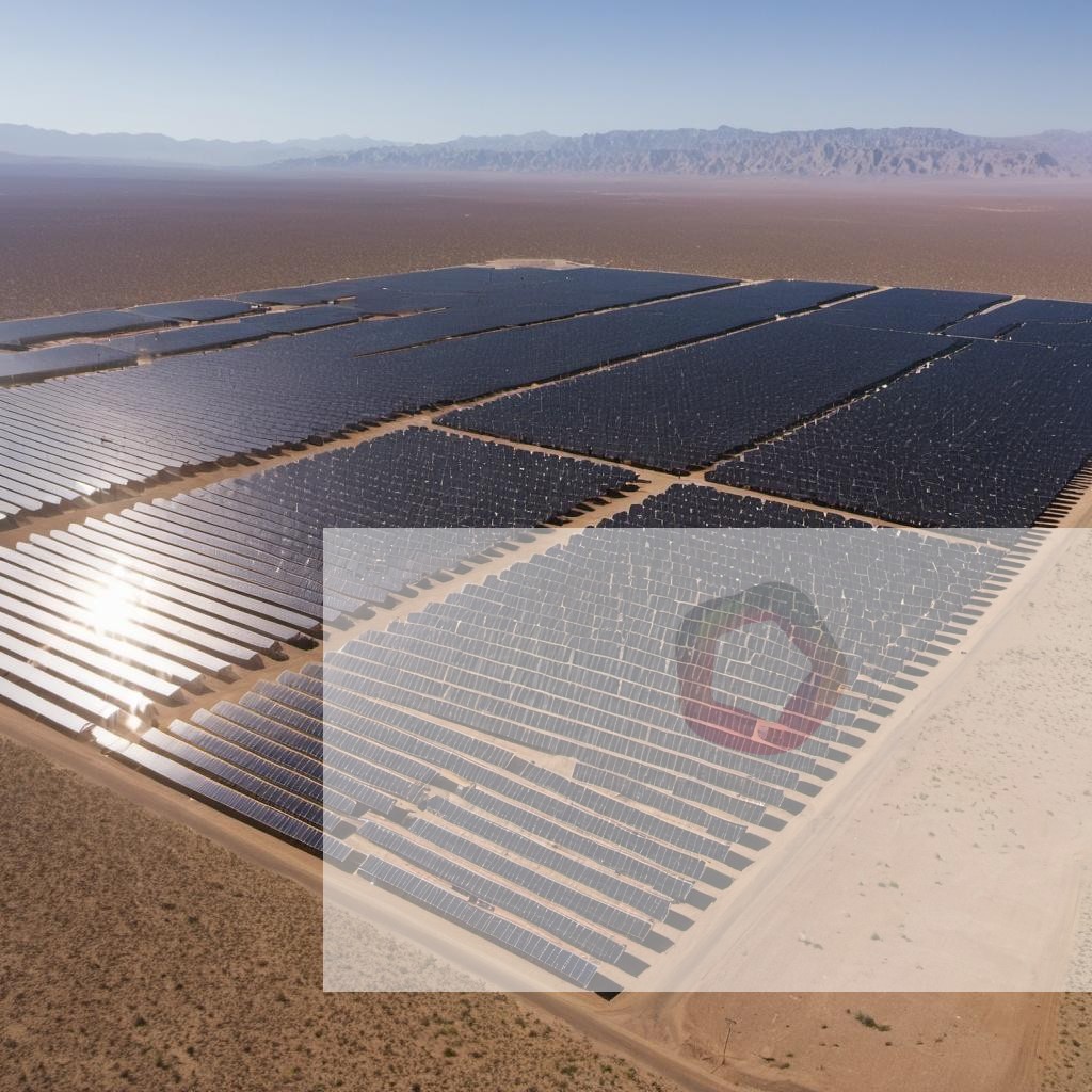 A solar panel farm with hundreds of panels facing the sun in a desert