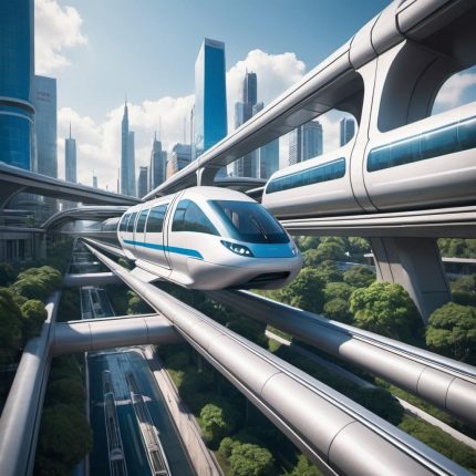 A monorail gliding smoothly through a futuristic urban landscape