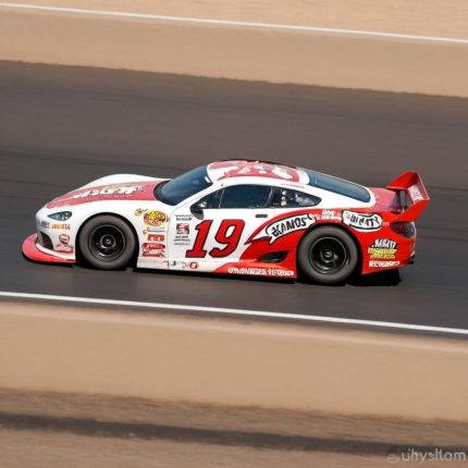 A race car with sponsor decals speeding down a straight track