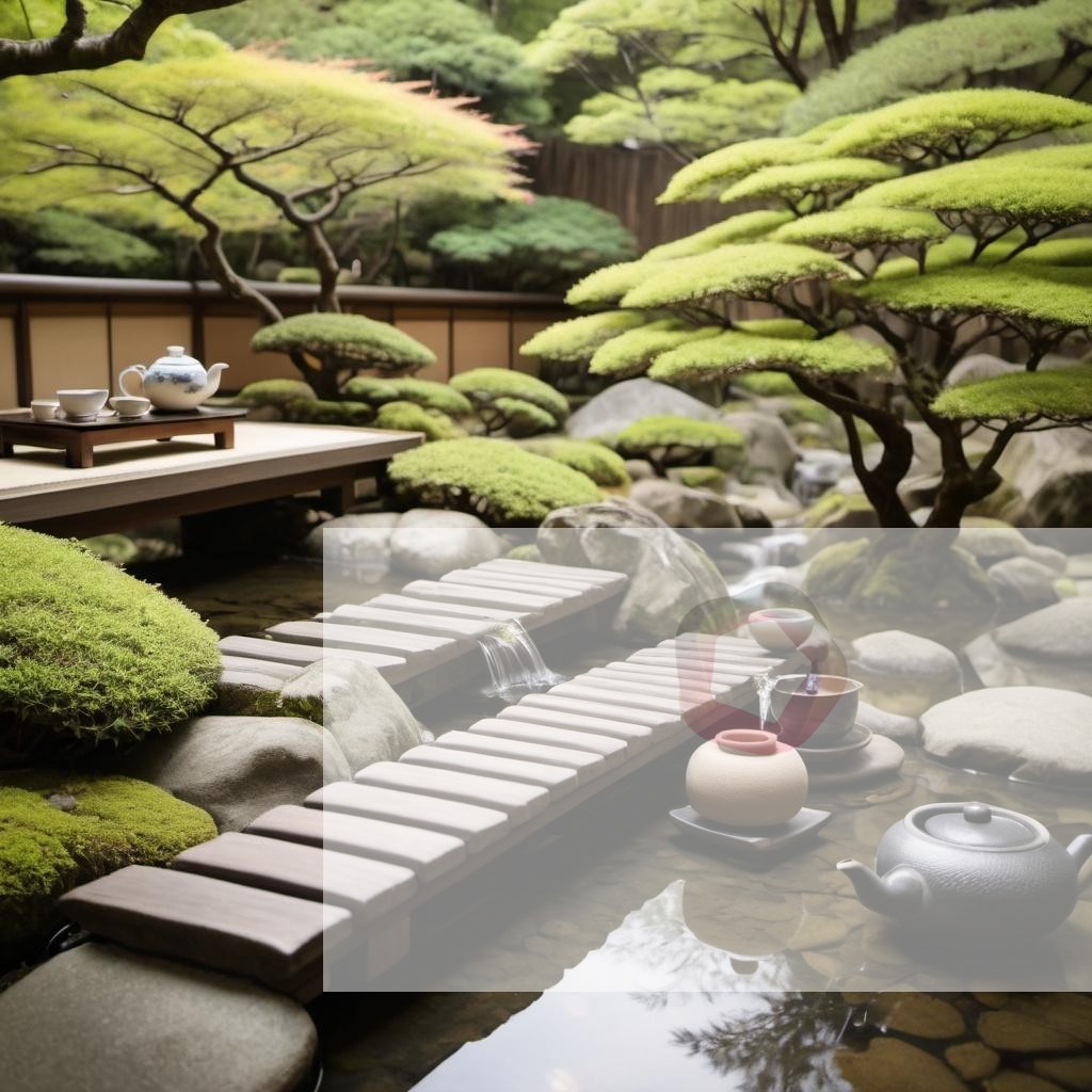 A tranquil tea ceremony taking place in a Japanese garden, with a gentle stream flowing nearby