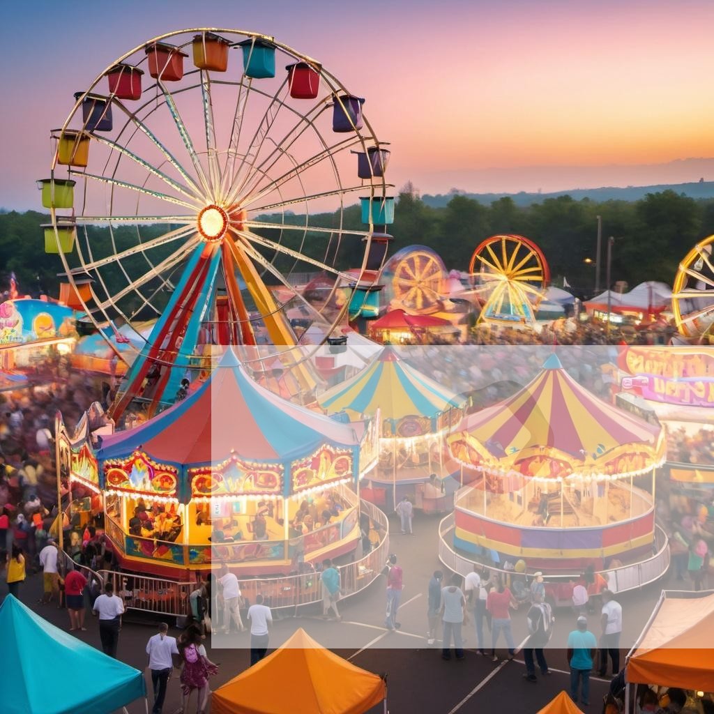 A vibrant carnival with colorful tents, ferris wheel, and happy people enjoying various rides