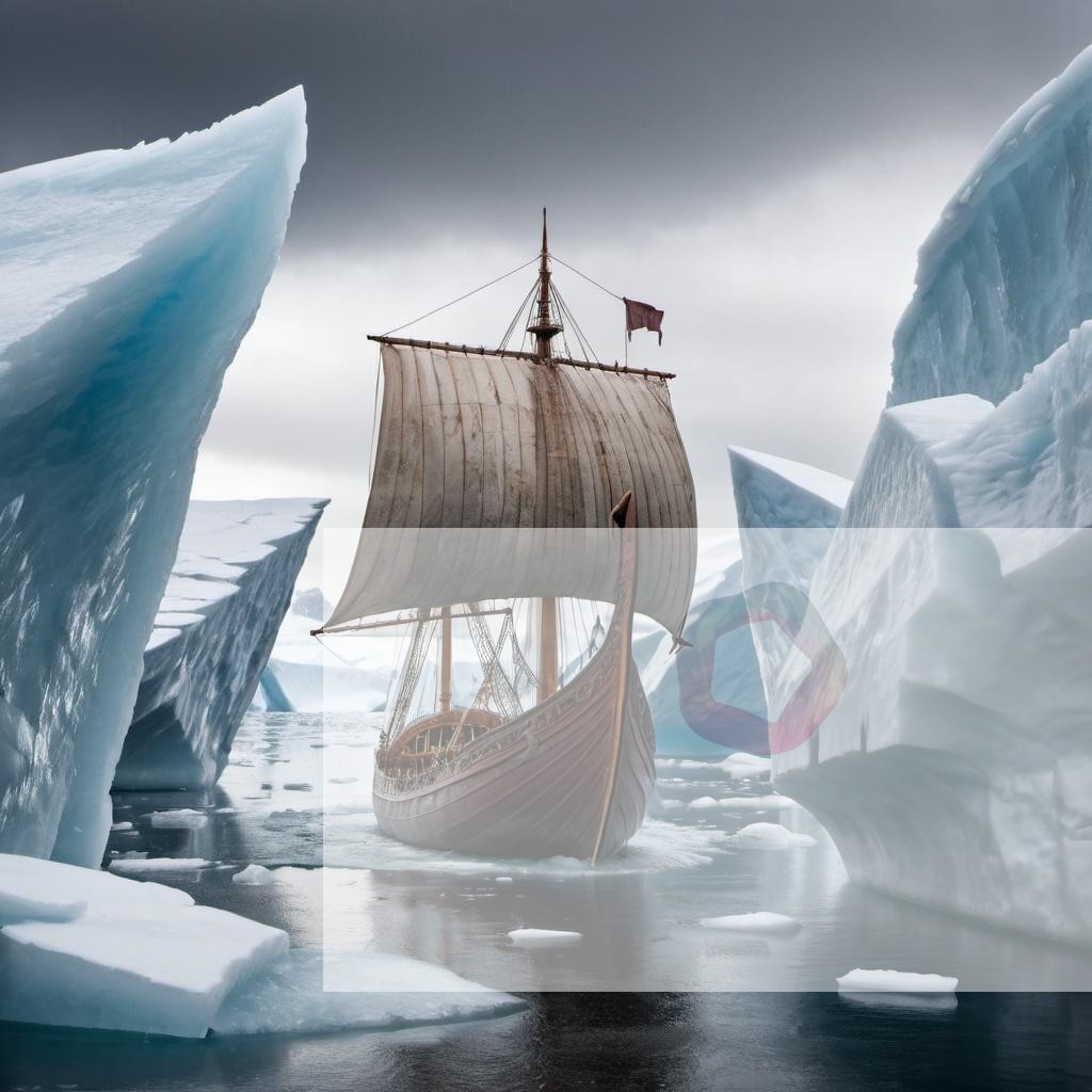 A Viking ship sailing through icy waters, surrounded by towering icebergs