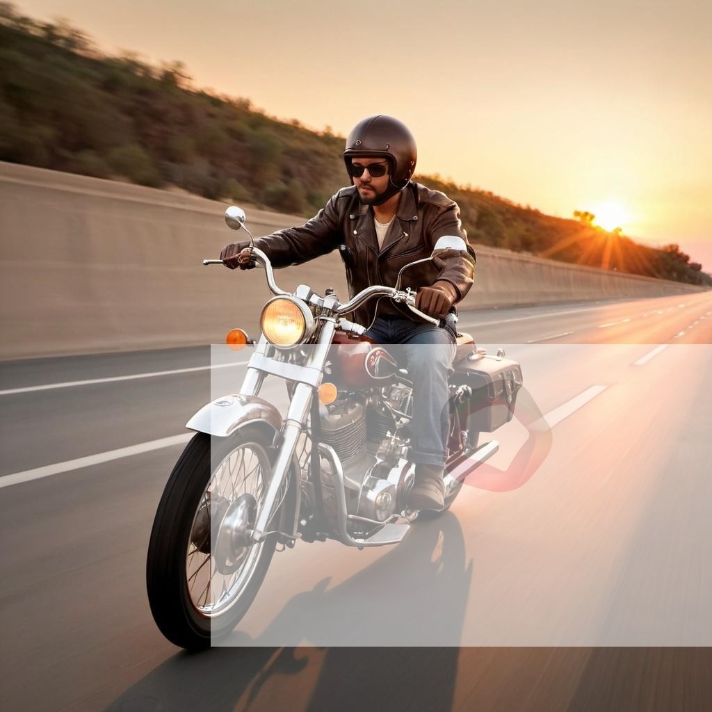 A vintage motorcycle speeding down an empty highway at sunset
