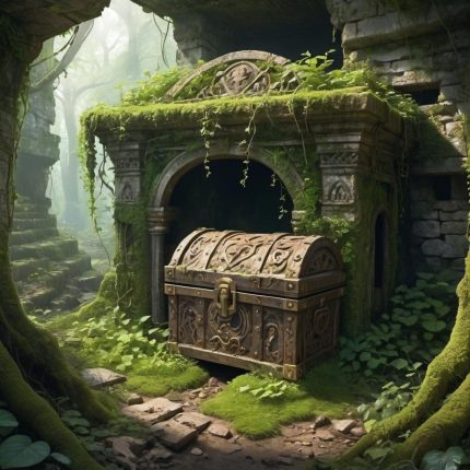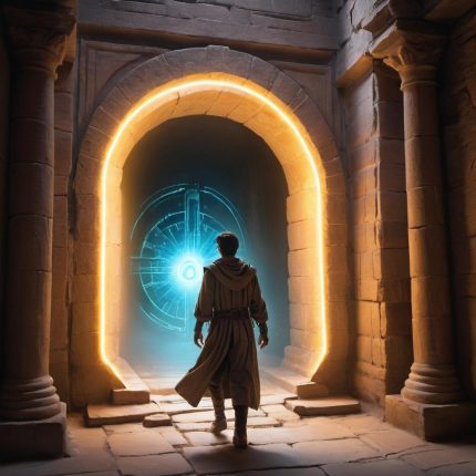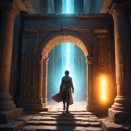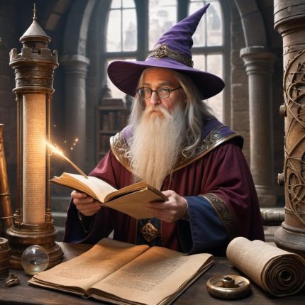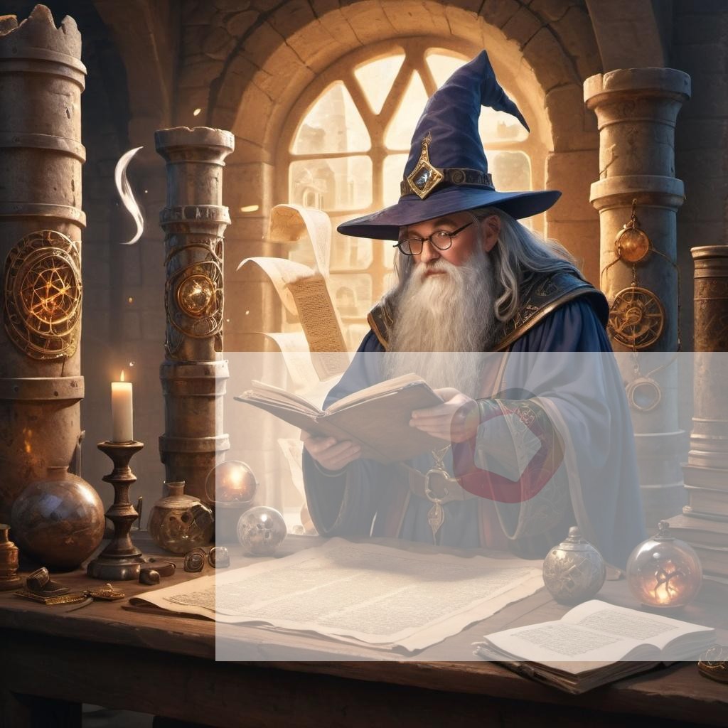 A wizard studying ancient scrolls in a tower filled with magical artifacts